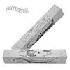 The Noodler's Ahab flex pen features a steel flexible #6 nib and a slide piston mechanism. If you'd like, you can even remove the piston mechanism and use the pen as an eyedropper for a massive 6ml ink capacity. This blue Ahab is made of a celluloid derivative and is technically biodegradable and formed from a "renewable resource". The vegetal resin body of this pen may show particles or striations within the material. This is most noticeable in demonstrators and bright colors.
