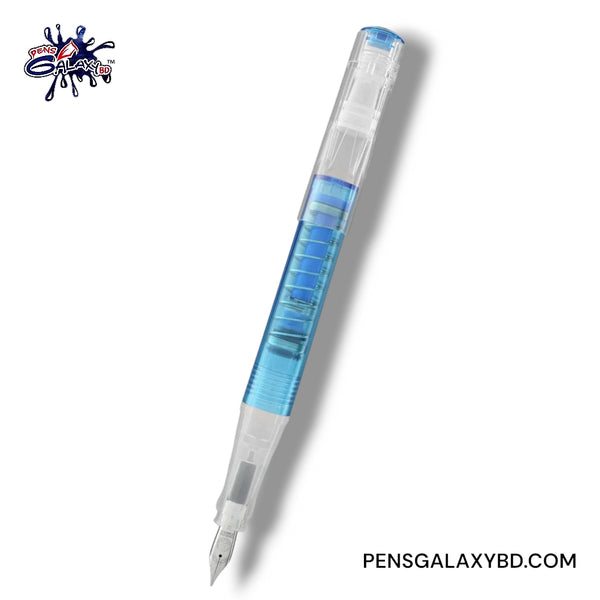 A unique feature of this model is the spring loaded piston. This pen has a translucent blue body and clear grip section, so you can see your ink and the spring piston mechanism at work, and has a clipless push/snap cap.