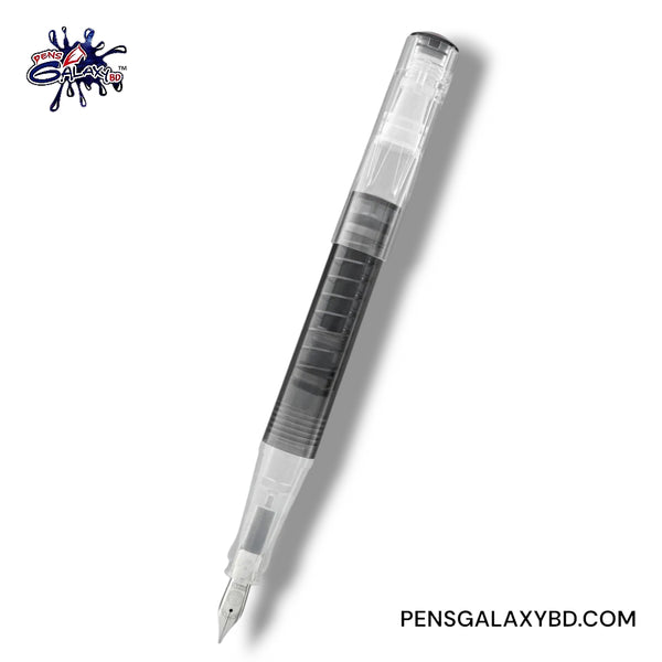 A unique feature of this model is the spring loaded piston. This pen has a translucent smoke grey body and clear grip section, so you can see your ink and the spring piston mechanism at work, and has a clipless push/snap cap. It is incredibly easy to fill this pen from bottled ink - simply unscrew the barrel to access the plunger, submerge the pen’s nib down into the ink, press down on the piston to compress the spring, and it will fill the barrel with ink! Screw the barrel back on and you’re ready to write. It is completed with a silver stainless steel nib.